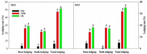FSS处理使玉米茎秆表皮穿刺强度、抗折断强度和抗拔强度分别达到61.3 N·mm-1、365.7 N·mm-1和340.3 N,显著优于UPM和CK。这种力学优势直接转化为倒伏抵抗能力——FSS的根倒伏率较CK降低91.5%。