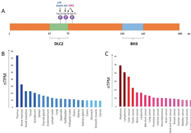 转录层面受FOXO3正调控和YAP/TEAD/SLUG复合物负调控;表观遗传方面,组蛋白去乙酰化酶抑制剂(HDACi)如伏立诺他可上调Bmf表达。翻译后修饰中,p38 MAPK磷酸化Thr72位点促进Bmf-DLC2解离,而ERK2磷酸化Ser74/Ser77则抑制其活性。