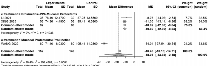 三篇研究显示UDCA可显著降低血清胃泌素(GAS)水平达18.03 ng/L。元回归发现对照组使用"黏膜保护剂+PPIs+PAs"三联方案时降幅更大(23.22 ng/L),这可能与多靶点调节胃肠激素有关。