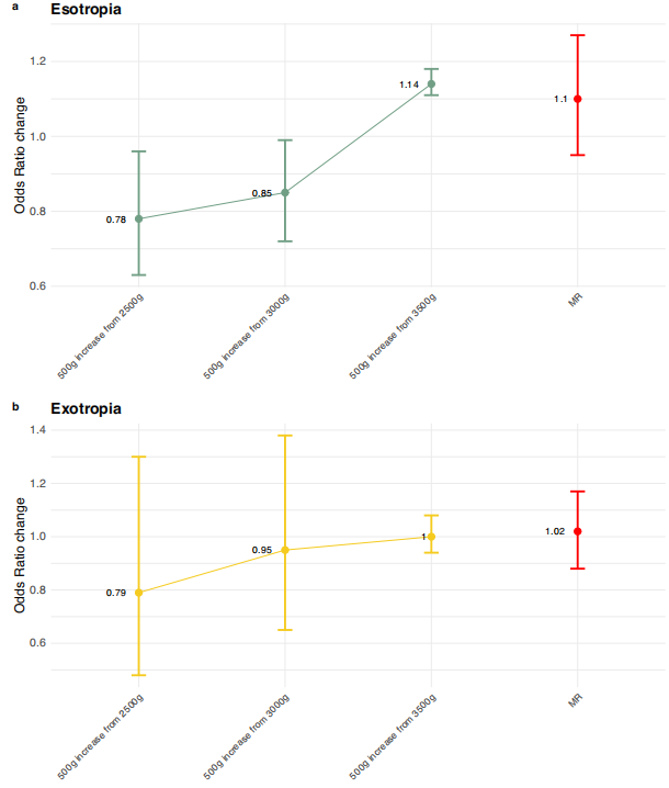 MR结果与Torp-Pedersen等报告的出生体重与斜视关联趋势一致,但效应量更精确。