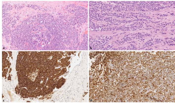 SCNEC具有特征性形态:细胞体积小、染色质致密、核仁不明显,常见核铸型。免疫组化显示>90%病例表达至少一种NE标志物,FOXA2阳性率75%,RB1缺失率90%,Ki67通常>80%。值得注意的是,约50%病例存在TMPRSS2-ERG融合,但AR表达缺失提示对内分泌治疗耐药。
