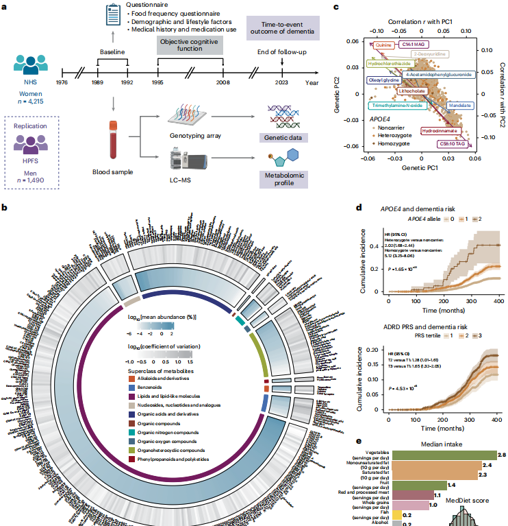 为破解这一科学难题,由Yuxi Liu、Dong D. Wang等组成的国际团队在《Nature Medicine》发表重要成果。研究创新性地整合美国护士健康研究(NHS)4,215名女性和健康专业人员随访研究(HPFS)1,490名男性长达34年的前瞻性数据,结合血浆代谢组学(401种代谢物)、基因分型(75个AD/ADRD风险变异)和地中海饮食评分,首次绘制出基因型依赖的代谢风险图谱。