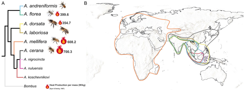 在自然界中,蜜蜂的分布范围与温度适应性密切相关——西方蜜蜂(Apis mellifera)和东方蜜蜂(A. cerana)成功拓展到温带地区,而它们的近亲如小蜜蜂(A. florea)和黑大蜜蜂(A. laboriosa)却只能栖息在热带。这种差异背后隐藏着怎样的生理奥秘?最新发表在《npj Biofilms and Microbiomes》的研究揭示,肠道微生物与宿主的代谢协同可能是关键所在。