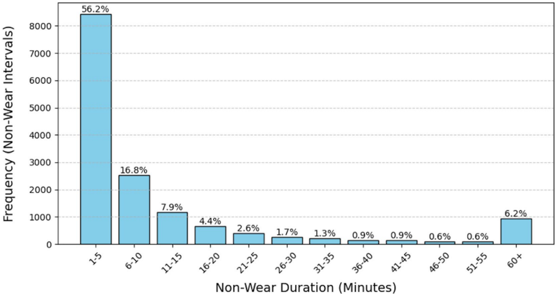 算法在现场数据中识别出20,749个非佩戴区间,其中超过半数持续时间≤3分钟(图6),平均时长17分钟。这种对短暂非佩戴的高灵敏度是以往方法无法实现的。浴室充电(63.6%)和设备充电(34.0%)是主要非佩戴原因。