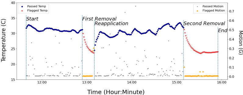 研究团队设计了精巧的实验方案:在5小时实验室会话中,参与者被要求在45分钟和180分钟两个固定时间点摘除设备10-20分钟,由此产生明确标注的非佩戴区间。通过分析36名参与者(50%女性,平均50.6岁)的数据,发现佩戴时平均温度为31.2±1.7°C,运动为0.11±0.14g;非佩戴时则降至25.7±2.5°C和0.02±0.04g。