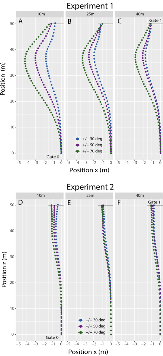 为解答这些问题,A.J. Jansen与Brett R. Fajen在《Scientific Reports》发表的研究中,设计了一套精妙的无人机模拟实验系统。通过Unity引擎构建三维环境,设置固定位置的Gate 0(起点)和Gate 1(第一航点),动态调整Gate 2(第二航点)的角度(±30°/50°/70°)、距离(10/25/40 m)和方向(0°/±20°)参数。19名受试者在Experiment 1中操控高惯性无人机(最大角速度54°/s,最小转弯半径7.35 m),20名受试者在Experiment 2中操控高敏捷无人机(最大角速度78°/s,可零半径转向),通过Xbox控制器完成三航点穿越任务。研究采用重复测量ANOVA分析轨迹参数,通过95%置信区间(Loftus-Masson法)评估条件差异。