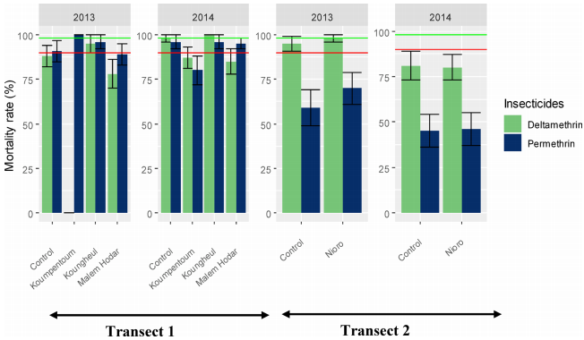 在IRS实施区,按蚊种群对拟除虫菊酯呈现空间异质性抗性:Koungheul地区对氯菊酯(permethrin)和溴氰菊酯(deltamethrin)分别表现92%和95%死亡率(疑似抗性),而Malem Hodar地区抗性更为显著(78-89%)。