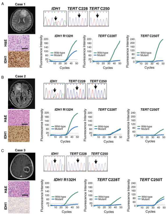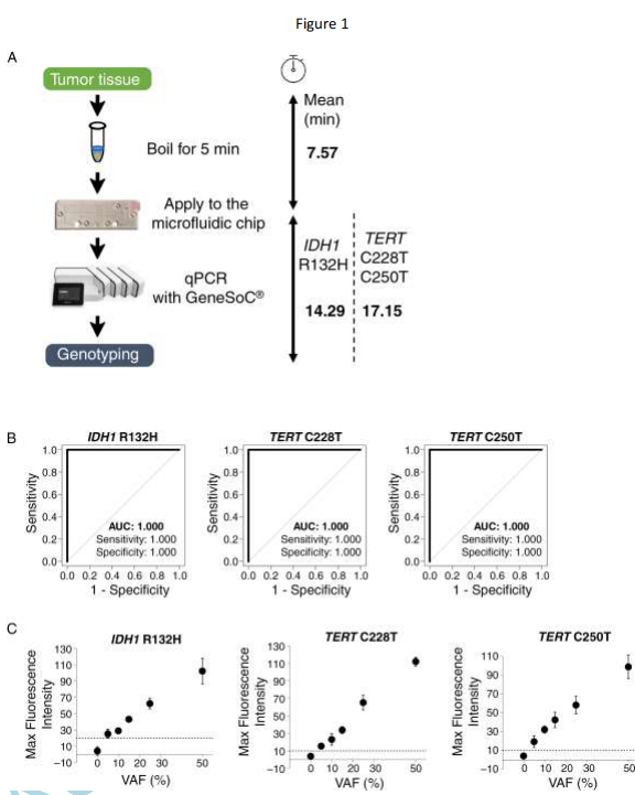 为解决上述问题,名古屋大学Sachi Maeda等团队开发了基于GeneSoC?微流控平台的快速基因分型系统。该研究通过187例样本验证(67例回顾性、120例术中),建立了一套可在25分钟内完成IDH1 R132H和TERT C228T/C250T突变检测的技术方案。关键技术包括:1)采用煮沸法实现7.5分钟快速DNA提取;2)优化微流控芯片热循环参数(50个PCR循环仅需14-17分钟);3)建立荧光阈值判定标准(IDH1为20,TERT为10);4)结合术中涂片验证肿瘤细胞含量。