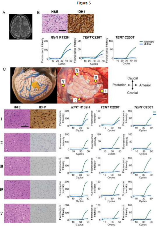 图5展示的60岁男性病例中,系统不仅准确诊断左额叶少突胶质细胞瘤(IDH突变型/1p19q共缺失型),更通过多点采样发现常规MRI未显示的肿瘤浸润区域(位点III)。另一39岁患者(图4)的切除腔壁组织检测确认无IDH突变,为全切评估提供分子依据。