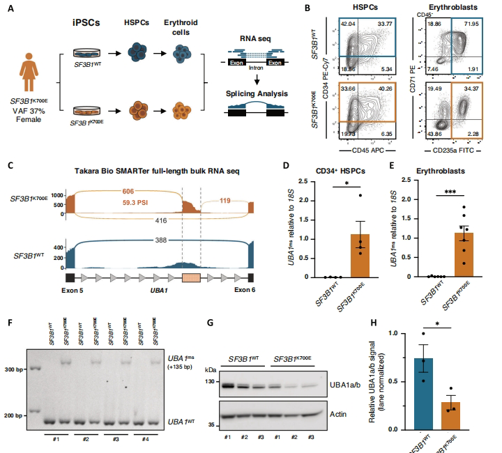 研究团队利用SF3B1K700E突变型和野生型(WT)诱导多能干细胞(iPSC)分化为造血细胞,通过全长RNA测序发现UBA1异常剪接事件。采用患者队列(83例SF3B1突变型MDS)验证临床相关性,结合K562细胞模型和HEK293T转染实验解析蛋白稳定性机制。关键实验包括:多核糖体分析、环己酰亚胺追踪实验、蛋白质免疫印迹,以及原代CD34+细胞集落形成试验评估TAK-243药效。