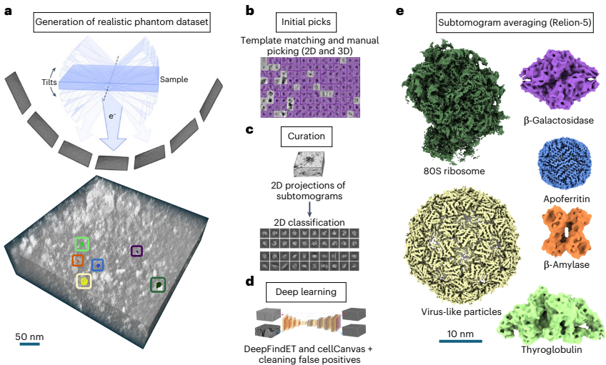 研究人员采用的主要技术方法包括:1)通过功能化电镜网格捕获溶酶体富集的细胞裂解液,模拟真实细胞环境;2)整合六种分子量跨度达一个数量级的纯化蛋白(从268kDa的β-淀粉酶到4.3MDa的核糖体);3)使用Krios G4电镜收集1,070组倾斜系列图像;4)开发DenoisET算法进行图像降噪处理;5)结合PyTom模板匹配、二维板层挑选和人工标注生成初始标记;6)应用DeepFindET和CellCanvas深度学习模型实现自动化标注。