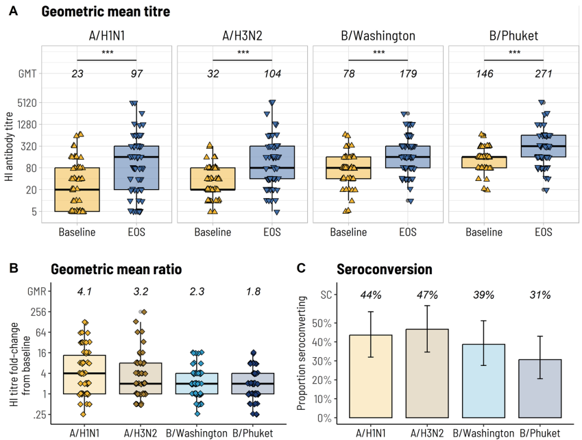 血清转化率(SC)提升最显著的是A/H3N2(31.7%→46.7%,p=0.008)