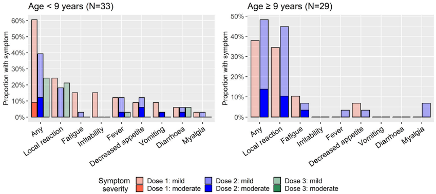 强化方案耐受性良好,所有患儿完成全程接种。不良反应以轻度为主(<9岁组:51.5%首剂后发热;≥9岁组:34.4%次剂后局部反应),无严重事件。值得注意的是,<9岁患儿第三剂的不良反应率(24.2%)反低于前两剂,颠覆了"剂量累积增加风险"的假设。