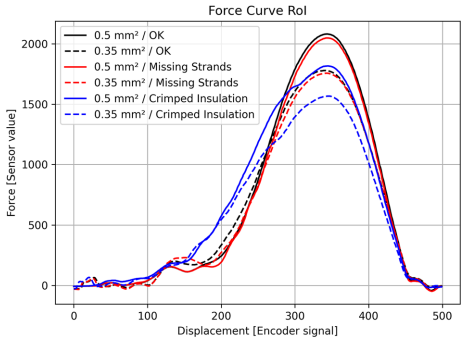 数据集包含两个导体-端子组合的力曲线,其中Crimped Insulation类在RoI起始段(约150数据点)呈现显著陡峭特征,而Missing Strands类则表现为轻微波动。0.50mm2导体的峰值压力比0.35mm2高出约30%,反映出材料特性的关键影响。