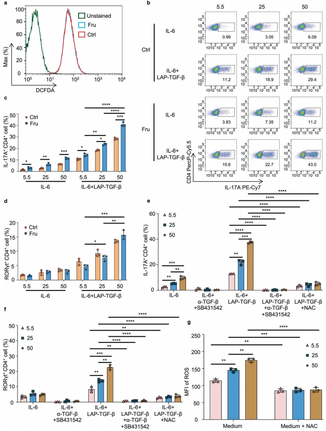 高果糖环境促进T细胞内ROS积累,激活潜伏态TGF-β,该过程可被抗氧化剂NAC阻断。在IL-6+latent TGF-β1培养体系中,果糖剂量依赖性增强Th17分化。