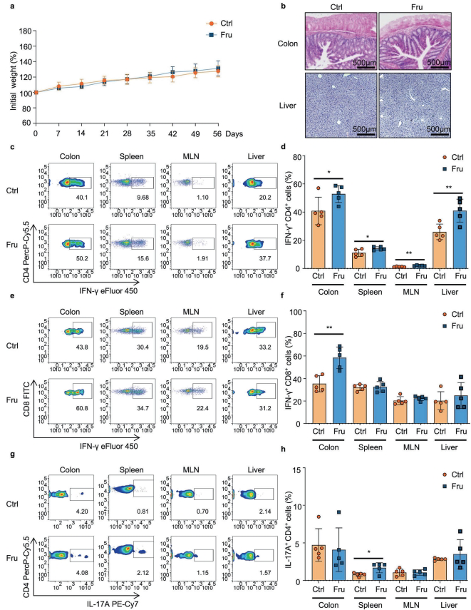 通过2个月20%果糖饮水干预发现,小鼠结肠、脾脏等组织中IFN-γ+CD4+ T(Th1)和IL-17A+CD4+ T(Th17)细胞比例显著增加,而Treg等调节性T细胞无显著变化。