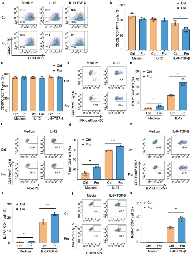 体外实验表明,25mM果糖培养条件下,na?ve T细胞中IFN-γ、T-bet(Th1标志)和IL-17A、RORγt(Th17标志)的mRNA和蛋白表达均显著上调,且该效应不依赖于T细胞活化状态。