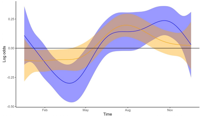 GAMM模型进一步揭示,狼群对湿地的选择在1-7月持续增强,而对河狸巢穴的利用则呈现"U型"曲线:4月最低(log odds=-0.8),6月转为正选择,10月达峰值(log odds=1.2)。这种精确的时间动态证实了狼群能敏锐捕捉河狸活动规律,在驼鹿幼崽可捕食性降低的夏末秋初转换捕食策略。