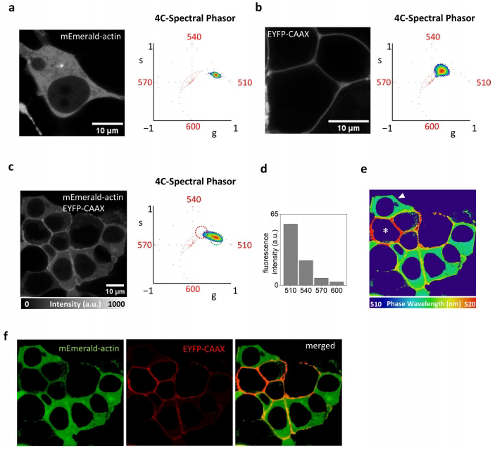 对表达mEmerald-actin(峰值515 nm)和EYFP-CAAX(峰值527 nm)的HEK293T细胞,4C-spectral phasor清晰区分了两种蛋白的空间分布。