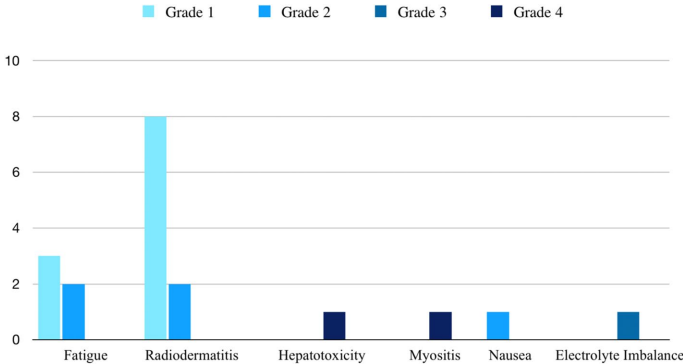 所有患者均出现G1不良反应(80%为放射性皮炎),50%发生G2事件(包括皮炎、疲劳和恶心)。值得关注的是两例严重毒性:1例接受III-IV级腋窝淋巴结照射者出现G3电解质紊乱(血钾2.69 mEq/L),导致放疗提前终止;另1例在放疗结束1个月后发生G4肌炎伴肝毒性,需永久停用免疫治疗。未观察到放射性肺炎或心脏毒性等预期担忧的不良反应。