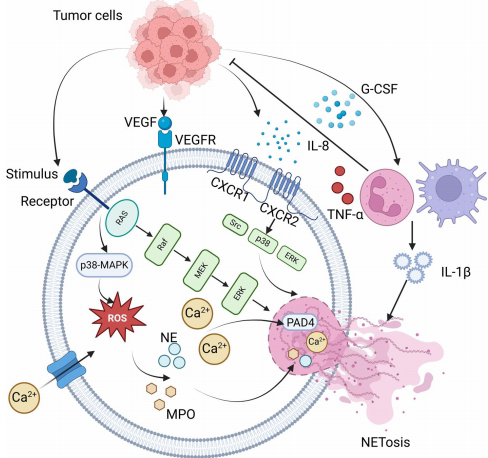 中性粒细胞胞外诱捕网(NETs)是由DNA骨架、组蛋白和抗菌蛋白组成的网状结构。其形成受NADPH氧化酶依赖和非依赖两条通路调控:前者通过ROS激活肽酰精氨酸脱亚胺酶4(PAD4)促进组蛋白瓜氨酸化;后者则通过钙离子内流和TLR信号触发。肿瘤微环境中,粒细胞集落刺激因子(G-CSF)和IL-8通过CXCR1/2受体激活Src-p38-ERK通路,显著促进NETs释放。