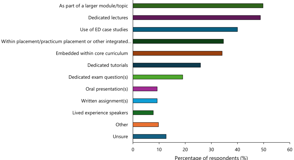 教学方法上,ED内容多被嵌入更大模块(49.8%)或核心课程(34.1%),主要通过讲座(48.8%)和案例分析(40.0%)传授。令人关注的是,仅7.8%的课程邀请有生活体验者(Lived Experience, LE)参与教学,32%的课程完全不提供ED相关临床实习机会。