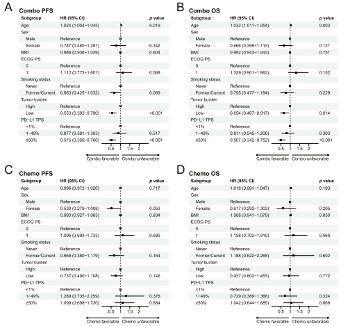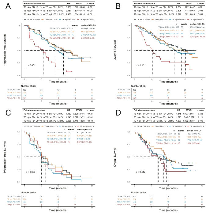 研究团队进一步将TB与PD-L1表达进行联合分析,发现高TB且PD-L1低表达患者生存期最短,从化疗免疫联合疗法中获益最小(PFS:5.53 vs. 5.07个月;OS:10.52 vs. 13.80个月)。