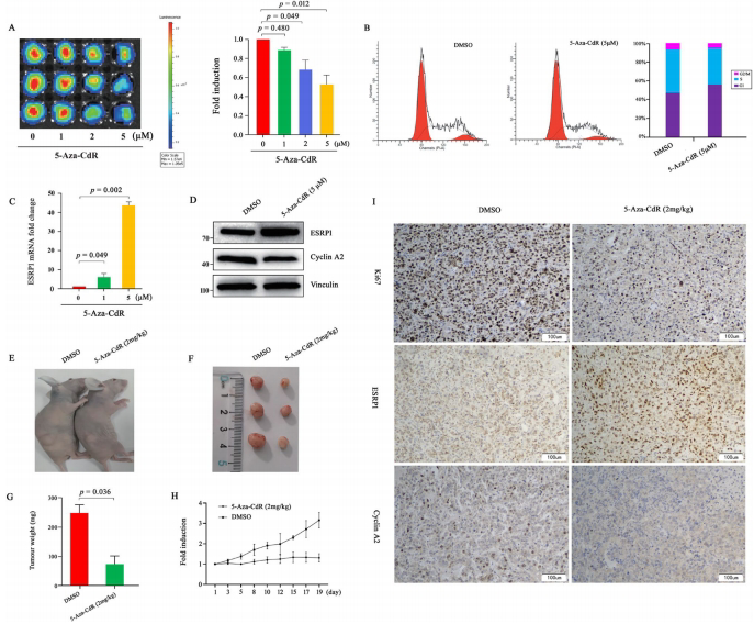 研究核心创新在于构建pGL4.19-ESRP1-P-Luc2报告系统。该载体将ESRP1启动子与荧光素酶基因融合,在稳定转染的A498-ESRP1-P-Luc2细胞中,5-Aza-CdR处理使荧光素酶活性提升140倍,且体内外实验均显示生物发光信号与ESRP1表达呈正相关。SCID-裸鼠移植瘤模型证实,该系统可实时监测2 mg/kg 5-Aza-CdR引起的肿瘤部位信号2.6倍增强。
