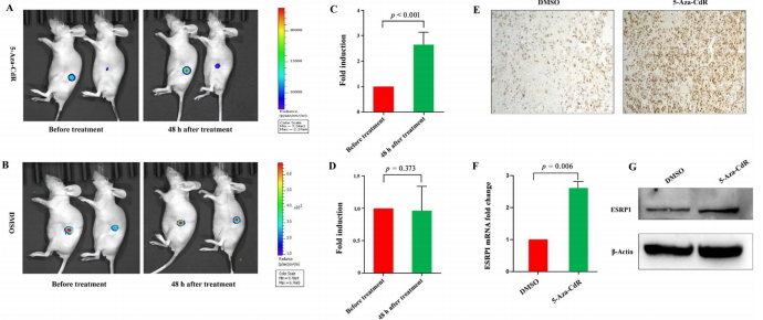 报告系统在5 μM 5-Aza-CdR处理下荧光素酶活性提升140倍,体内实验显示肿瘤区域信号增强2.6倍,Western blot证实ESRP1蛋白同步上调。
