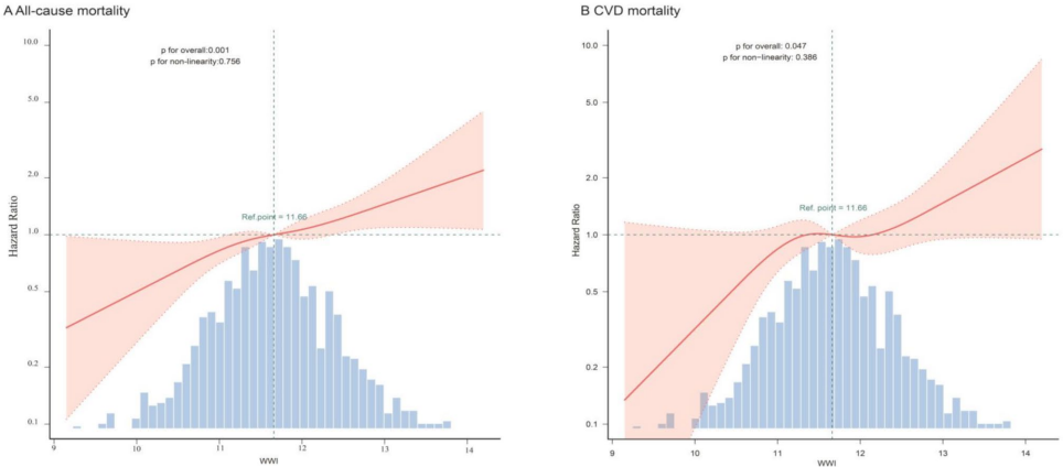 图3限制性立方样条分析打破传统肥胖指标的"安全阈值"假象,揭示WWI与两类死亡率均呈单调线性关系(P非线性>0.05)。这种"没有最安全,只有更危险"的模式,提示DR患者的脂肪毒性可能从WWI最低值就开始累积损伤。