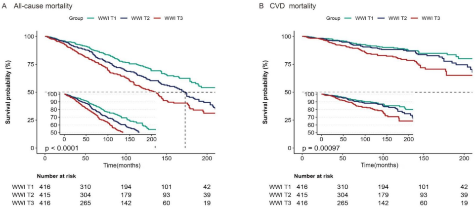 表1数据显示,高WWI组(T3)患者兼具"三高"特征:高甘油三酯(TG 1.88mmol/L)、高尿素氮(BUN 7.52mmol/L)和高炎症负荷(高血压患病率84.86%)。这些患者如同携带"代谢定时炸弹",其全因死亡率(41.83%)显著高于低WWI组(27.4%),心血管死亡率也呈现梯度上升(16.1% vs 10.1%)。