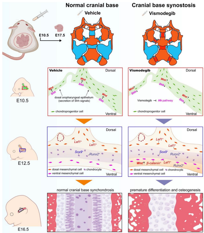 本研究针对颅底软骨过早闭合的发育机制难题,通过Vismodegib部分抑制Sonic hedgehog(Shh)信号,首次建立颅底早闭小鼠模型。研究发现E10.5时期Shh与Wnt信号在颅底原基共激活,Shh通过拮抗Wnt/β-catenin信号维持颅底软骨正常发育节奏,该机制为颅面畸形治疗提供新靶点。论文发表于《BMC Biology》。
