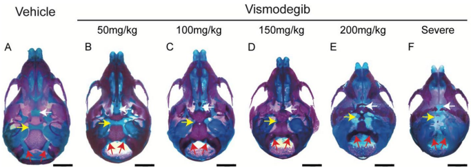 为突破这一限制,Jiangping Chen等研究人员创新性地采用小分子抑制剂Vismodegib建立条件性Shh信号干扰模型。通过不同剂量(50-200 mg/kg)的E10.5阶段性干预,发现150 mg/kg剂量组在维持胚胎存活的同时,能诱导E17.5小鼠出现颅底软骨过早闭合的典型表型。研究运用micro-CT三维重建、免疫荧光染色、RNAscope原位杂交等技术,系统揭示了Shh-Wnt信号对话在颅底发育中的时空调控规律。