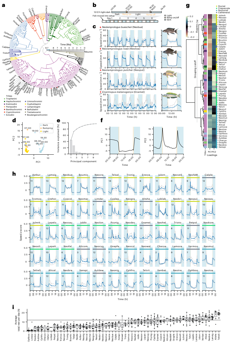 本研究通过长达一周的行为追踪实验,结合生态形态学和基因组学分析,揭示了非洲坦噶尼喀湖慈鲷鱼类(Cichlidae)在昼夜活动模式上存在显著分化。研究人员对60种慈鲷的500多个个体进行观测,首次证实时间生态位分化(temporal niche partitioning)在这一大规模适应性辐射中发挥重要作用,发现昼夜活动转换可能通过晨昏活动(crepuscular)的中间状态实现。基因组关联分析(GWAS)表明,活动模式差异与突触功能基因相关,而非核心生物钟基因。该研究为理解适应性辐射的驱动机制提供了新视角,发表于《Nature Ecology & Evolution》。