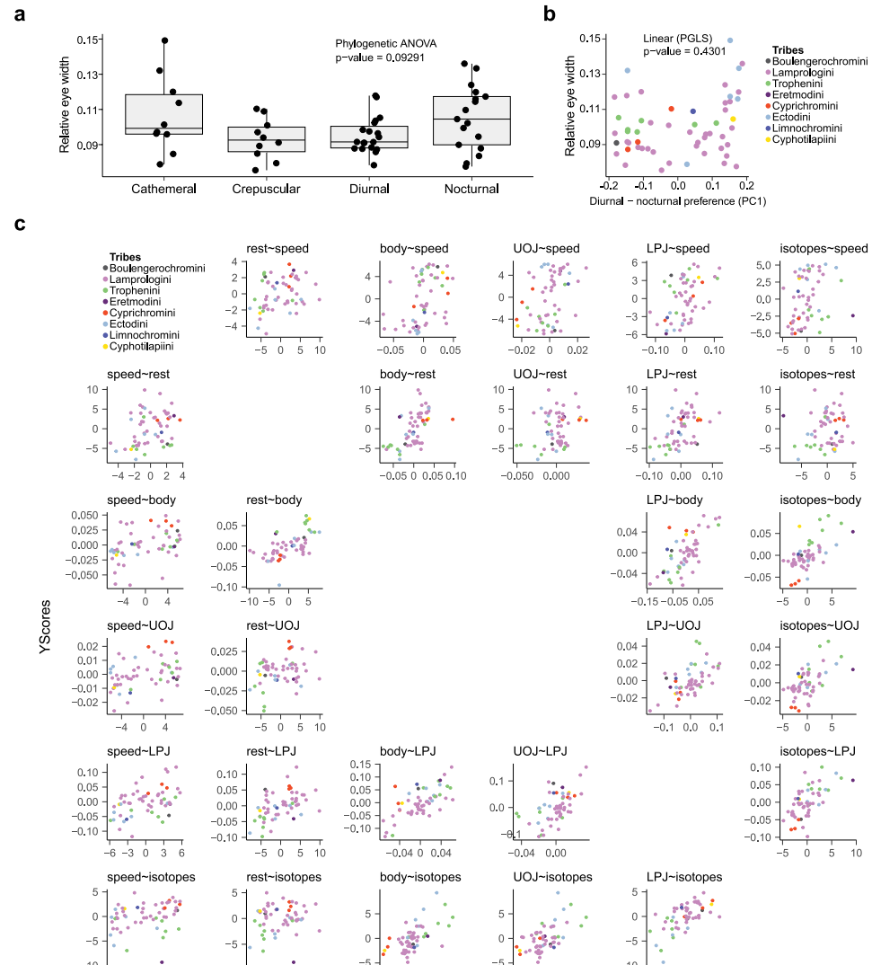 系统发育信号分析(Pagel's λ=0.63, Blomberg's K=0.47)表明活动模式未呈现强烈谱系保守性。关键发现是:生态形态相似的物种可能占据不同时间生态位(如三种食鱼性慈鲷Boulengerochromis microlepis、Cyphotilapia frontosa和Lepidiolamprologus elongatus分别呈现昼行、夜行和晨昏活动),而相同时间生态位的物种可分化出不同食性。