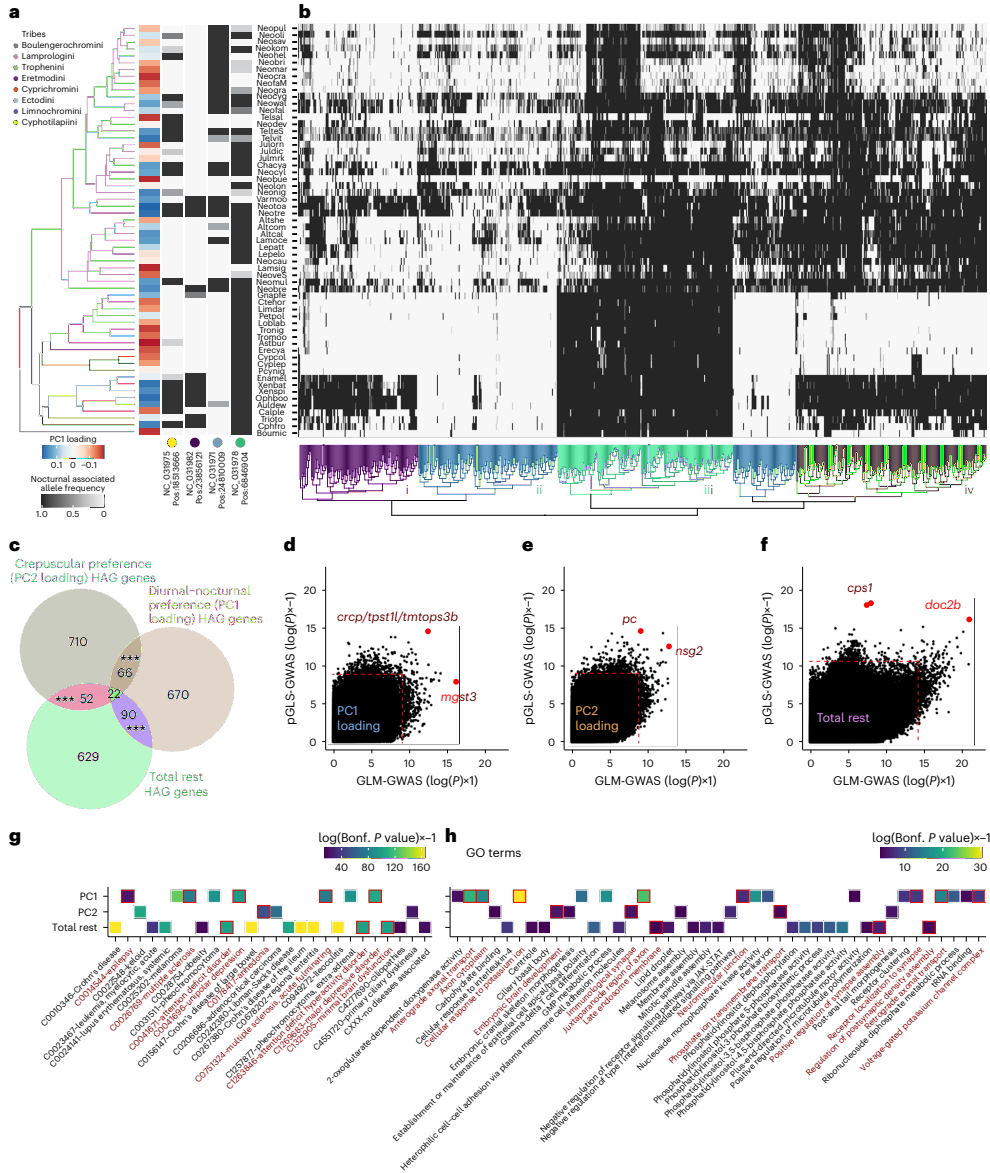 GWAS鉴定出848个与昼夜偏好相关的基因(HAGs),如调控神经肽CGRP的crcp基因和钙通道基因cacnb3b。GO分析显示这些基因富集于突触传递(synaptic transmission)和神经疾病相关通路(如癫痫、ADHD),而与核心生物钟基因无显著关联。