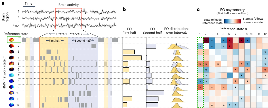 为解决这一科学难题,Mats W.J. vanEs和Cameron Higgins领衔的研究团队开发了创新的时序间隔网络密度分析(TINDA)方法,结合隐马尔可夫模型(HMM)分析五组独立脑磁图(MEG)数据集。研究使用英国MEG联盟(n=55)、剑桥老龄化神经科学中心(Cam-CAN,n=612)和人类连接组计划(HCP,n=79)等大规模队列,通过源重构将信号映射到皮层区域,采用时间延迟嵌入的HMM识别12种功能网络状态。关键创新在于TINDA方法通过分析网络状态重激活间隔内的动态变化,克服了传统马尔可夫假设的局限。