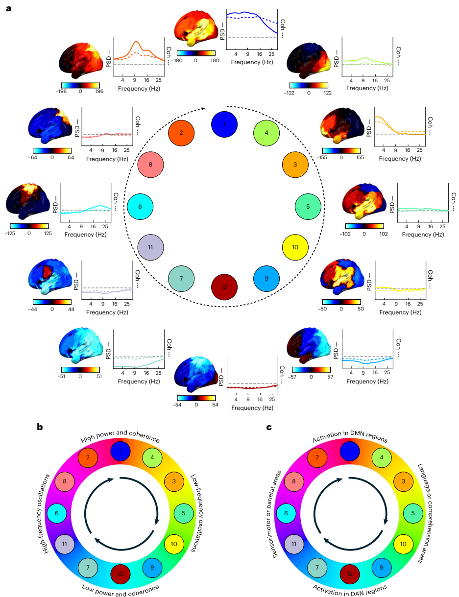 循环结构呈现出双模式分化:南北轴区分高/低功率状态,东西轴区分频率特征。上部象限状态显示δ(1-4Hz)和θ(4-7Hz)频段活动,与高级认知功能相关;左侧状态以α(7-13Hz)和β(14-30Hz)活动为主,右侧则以低频活动为特征。这种组织方式暗示不同认知功能在周期中有特定的相位定位,例如从DMN出发的转换与感觉运动抑制通过α/β功率增加相关联。