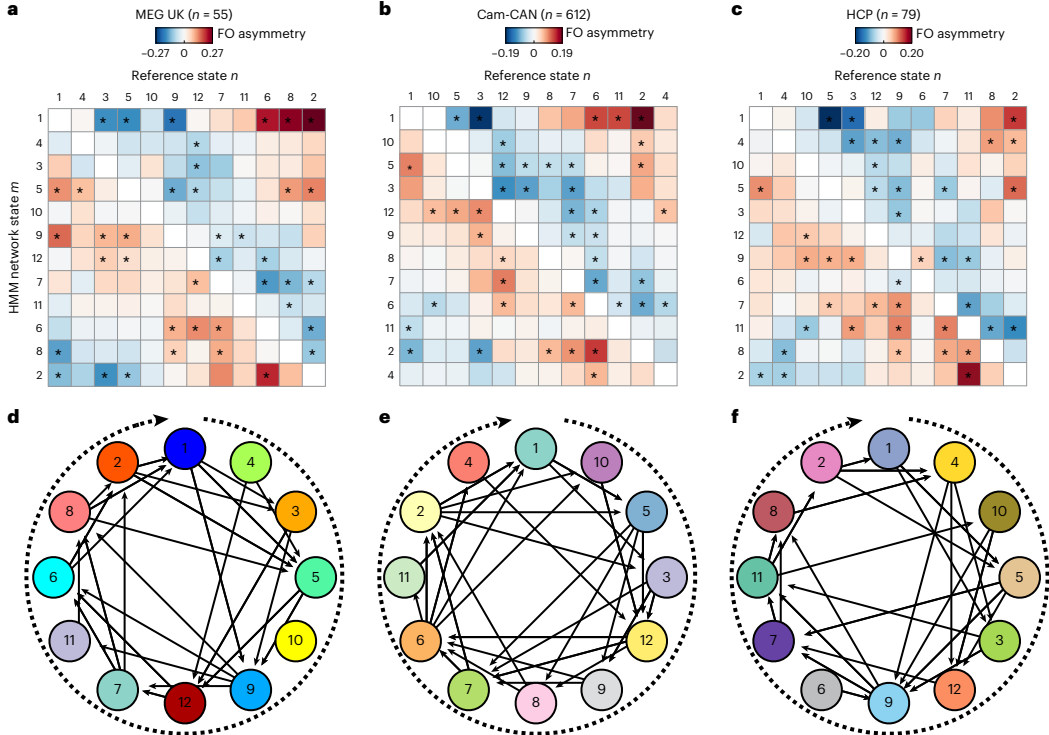 研究发现虽然单个网络转换是随机的,但整体上形成了稳健的周期性模式。在MEG UK数据集中,状态1(高相干性DMN相关状态)后倾向于激活状态5和9,而状态2和8则多出现在状态1之前。这种不对称性在所有数据集中重复出现,形成顺时针循环结构(S=0.066),经1000次排列检验证实显著(P<0.001)。值得注意的是,这种周期性结构将功能相似的状态聚集在特定相位:上部象限为高功率/高相干状态(如DMN),下部象限为低功率状态(如DAN和感觉运动网络)。