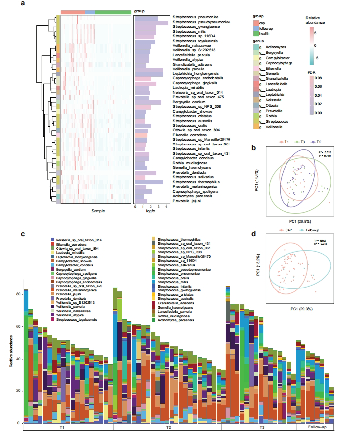 宏基因组分析显示CAP患者α多样性显著降低(p=0.02),且恢复期仍未能完全复原。链球菌属(Streptococcus)在急性期占比达8.9-21.4%,随访期进一步升至19%,显著高于健康对照。共现网络分析揭示患者样本中菌群互作边数仅健康组的22%(96 vs 433边/样本),提示生态网络严重破坏。