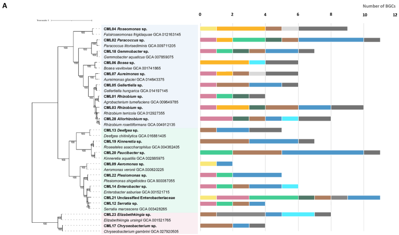研究采用多组学联用策略:通过16S rRNA扩增子测序比较苔藓虫与周边环境的菌群差异,发现仅有3.4%的序列变体(ASVs)为宿主特有;利用9种培养基分离获得29株菌(含潜在新种Roseomonas sp. CML04等),其基因组分析显示惊人的代谢潜力——256个BGCs中83%与已知基因簇相似度低于60%。