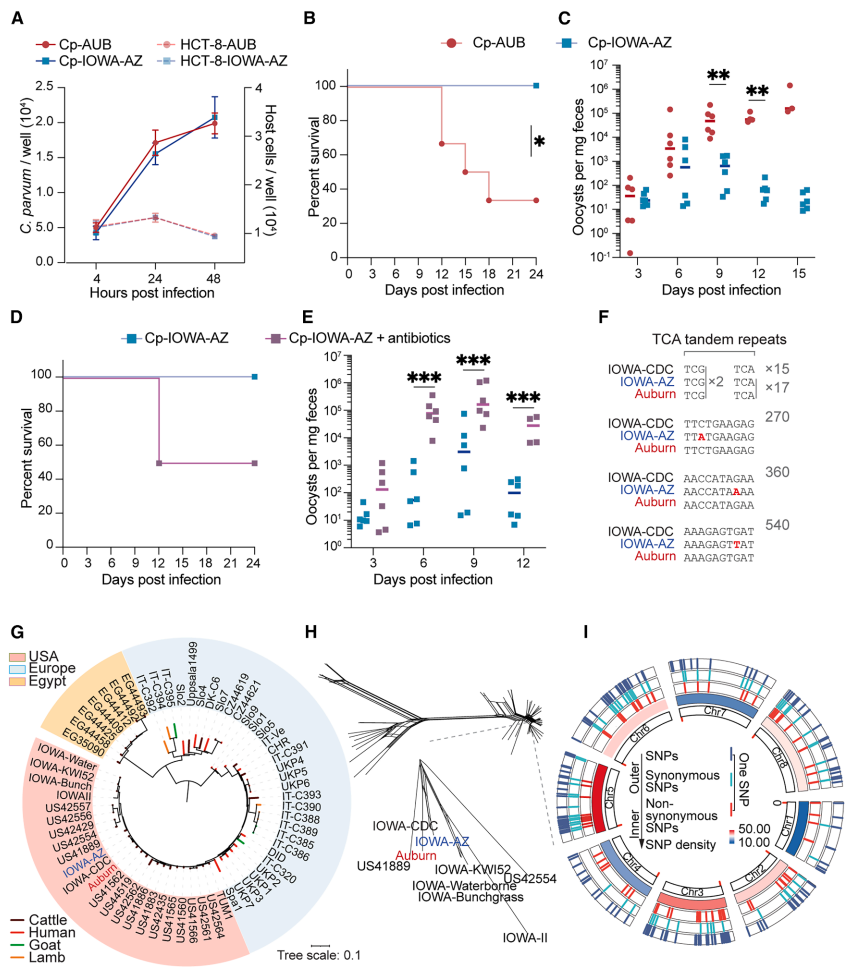 研究人员采用全基因组测序(WGS)、批量分离分析(BSA)和CRISPR-Cas9基因编辑等关键技术,比较了毒力差异的隐孢子虫IOWA-AZ和AUB虫株。实验使用免疫缺陷小鼠模型(包括IFN-γ受体敲除小鼠)和体外培养系统,结合抗生素处理揭示微生物组的影响。