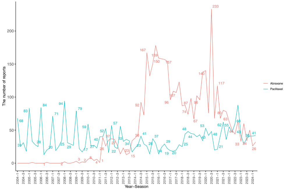 在时间趋势分析中,nab-paclitaxel的不良事件报告呈现稳定上升趋势,特别是血液学和肝胆毒性,反映了临床使用增加和对其毒性认识的深化。而paclitaxel的报告趋势相对平稳。