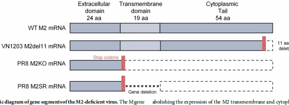 M2蛋白的胞质尾区对病毒组装至关重要。通过引入终止密码子删除M2胞质尾区11个氨基酸(M2del11)或完全敲除M2基因(M2KO),可获得复制受限的疫苗候选株。