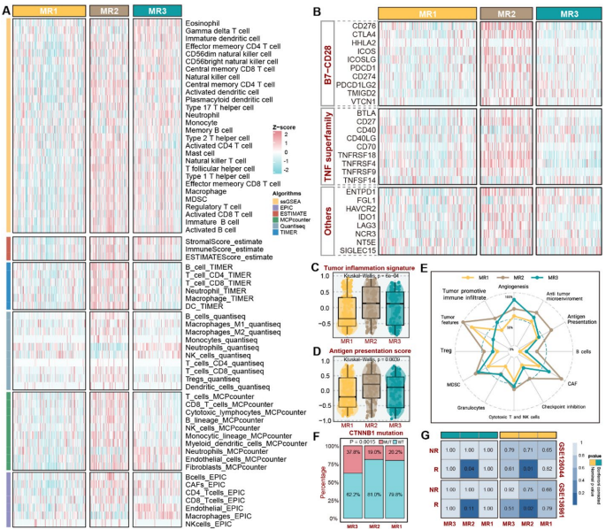 【免疫特征】MR2呈现"免疫激活"表型,CD8+T细胞浸润显著,PD-1、CTLA4等高表达;MR1为"免疫缺陷"状态;MR3显示中等免疫浸润。