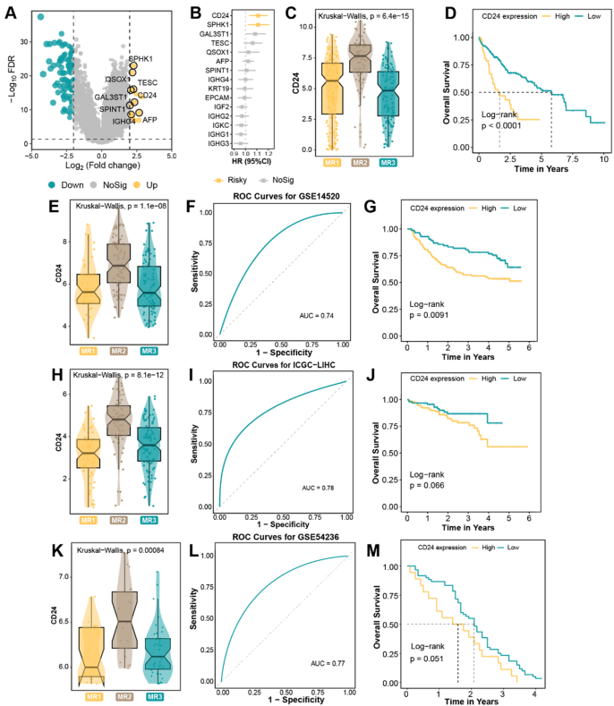 【CD24标志物】CD24在MR2中特异性高表达,其AUC值达0.74-0.78,高表达患者预后显著较差。