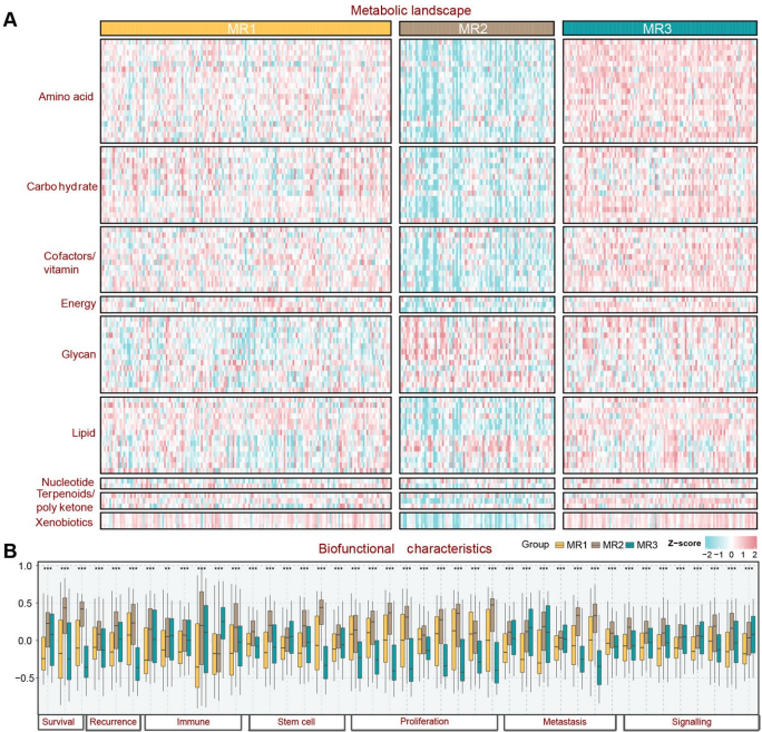 【MR亚型特征】MR1(占比45.5%)表现为中度预后和代谢活性;MR2(24.7%)具有最差预后、低代谢活性和强增殖能力;MR3(29.8%)则显示最佳预后和高代谢活性。