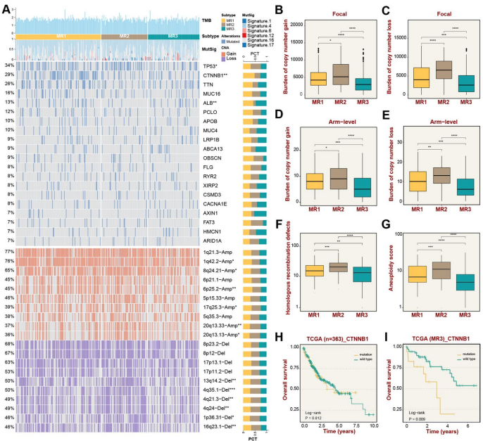 【基因组特征】MR2具有最高TP53突变率(35%)和基因组不稳定性;MR1富集CTNNB1突变(32%);MR3突变负荷最低。