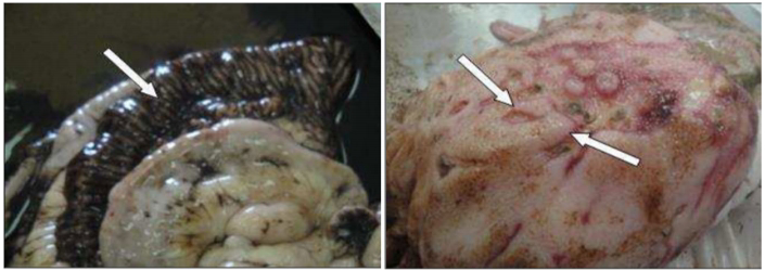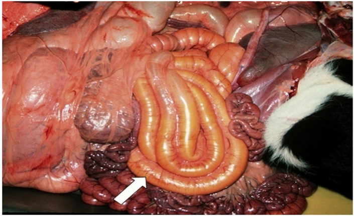 C. perfringens感染可导致犊牛真胃多发性溃疡(见图2),而ETEC K99则引发螺旋结肠膨满(见图3)。尸检需在死亡5分钟内进行以避免自溶干扰。