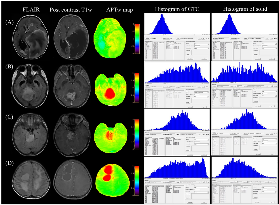 针对这一临床痛点,由Guisen Lin和Yijiang Zhuang领衔的研究团队在《BMC Cancer》发表了一项创新性研究。他们发现儿童与成人胶质瘤存在本质差异:成人低级别胶质瘤通常蛋白表达较低,而儿童pLGG却可能因微血管增生、蛋白丰富的微囊和粘液样物质导致蛋白浓度升高。这种"反常识"的生物学特性,使得直接套用成人APTw成像标准可能产生误导。研究团队由此提出科学假设:体积肿瘤APT直方图分析可能反映儿童胶质瘤的级别特征,但应用方式应与成人不同。